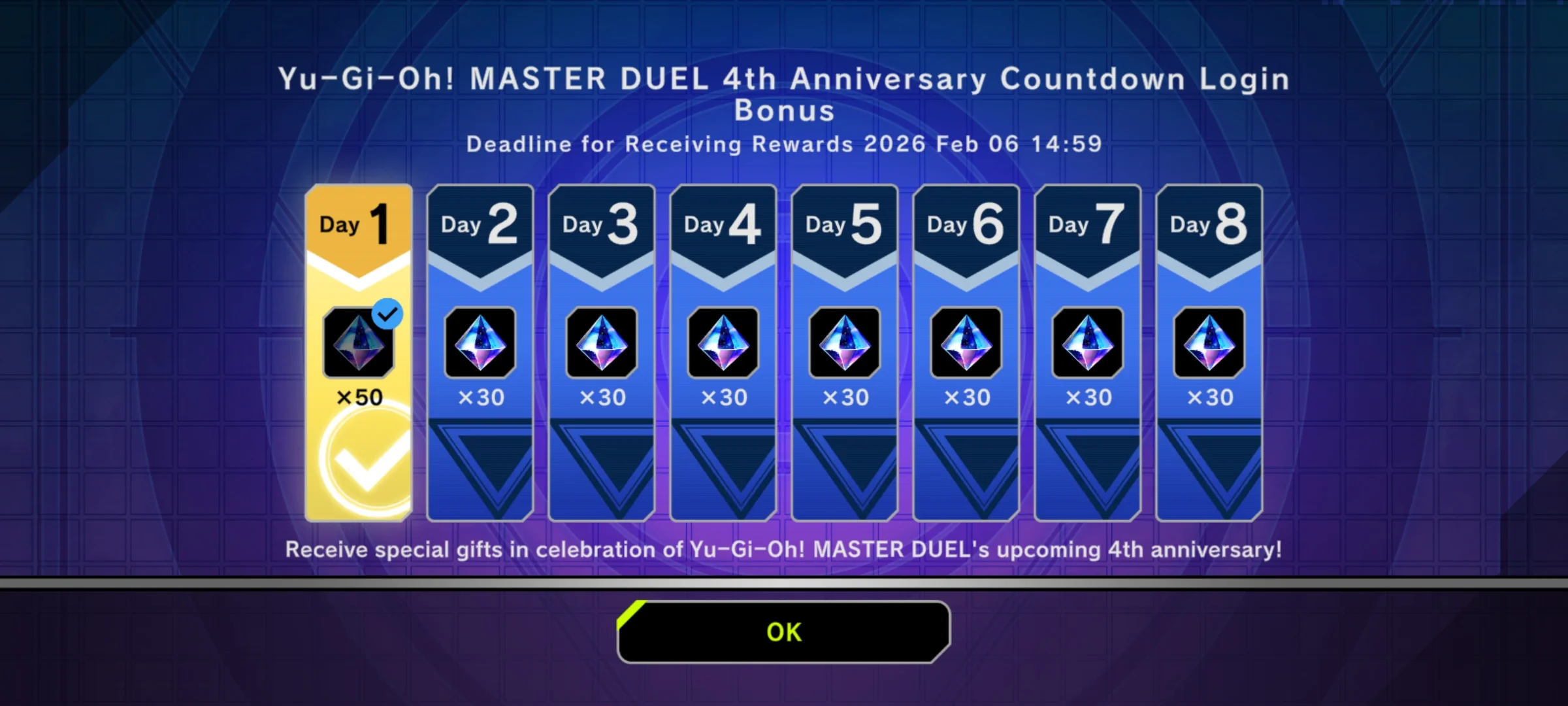 UPDATE: Konami have added a Daily Login Countdown bonus of 30 Gems leading up to the big Master Duel Anniversary Celebration Campaign on February 5th!